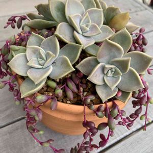 バイネシーさん🌸 水もしたたるいい多肉。 色もなかなかいい感じ。 水吸ってパッツンですが、下葉がちょっとグミになってた😭 頑張って夏を超えてちょうだい。 花芽なのかお子様なのか二つついてます😊