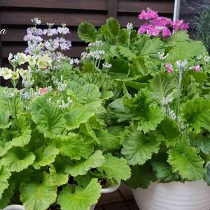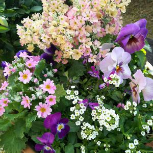プリムラさん集合🌸🌸🌸 ウィンティーはピーチ、サクラ、ライムの3色🌸 こぼれ種っ子も花が少々咲いてきました