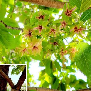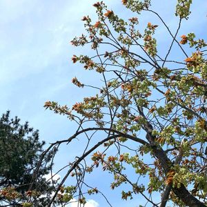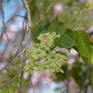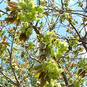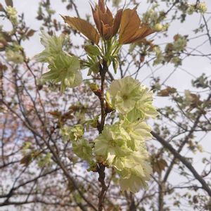 ギョイコウザクラ(御衣黄桜) 新緑の中の緑の八重桜 まだ開花し始めたところでほとんど緑💚 ぱっと見では、サクラが咲いているようには見えない写真になってしまいました💦
