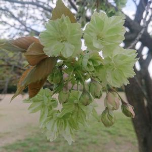 近所散策 ソメイヨシノが散った後 サクラ後編 in 日吉の丘公園 🌸ギョイコウザクラ (御衣黄桜) ーーーーーーーーーーーーーーー 🗒️ 花期:4月中旬~下旬頃 開花したばかりの花は淡い緑色、徐々に黄色に変化していき、やがて花びらの中心部が赤く染まっていくのが特徴です。