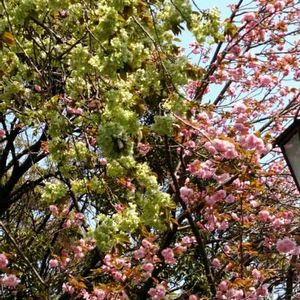4/13(土)① 世田谷松陰神社の御衣黄桜です。昨日は御意黄桜と字を間違えて書いていたことに夜気づいて直しました😅御衣黄でしたね 後ろにソメイヨシノがあるのも青空も綺麗でした🤗🎵