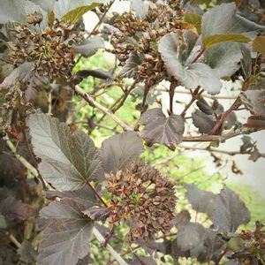 昨日は 雨の合間に散歩🐶🐶 バラ苑の隅に キレイな銅葉の茂み♪ 緑の芝生に 映えるんだろうな〜🍁 アメリカテマリシモツケ🍁 バラ科テマリシモツケ属 ディアボロさんかな?
