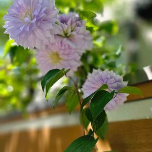 初クレマチスが咲きました(^^) うすーい紫色。好み〜😍 もっとふわふわしてもいいはず。