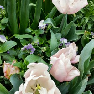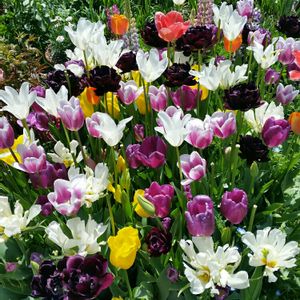 チューリップ花壇の現在。 最初に開いたオレンジ系、赤系は終わり、尖った花弁の白やアプリコット系オレンジ、白い縁取りの紫が登場。 まだつぼみがニョキニョキしてきてますので、またもう少ししたら色合いにも変化がありそうな感じです(*´-`)❤
