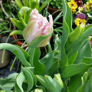 チューリップのリジョイスです。花びらの柔らかなカーブと淡いピンクがかわいい(*´-`)❤ もっと伸びるかと思って、これもヒヤシンスとパンビオの花壇奥に入れてしまいました。かき分けて覗き見る感じになってます。