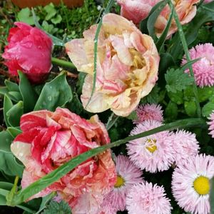 雨の中の開花となりました。これもだいぶ茎が短いです。全て同じ品種ですが、色幅があるようです。
