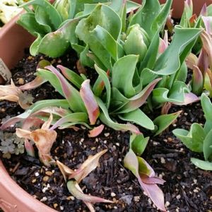 結構ぎっしりめに詰め込んだチューリップの鉢植えですが、生えて来ないとこが、、、。出てきても変な色。何ででしょう?冬の間の水切れ?日当たりが良すぎた??(T-T)