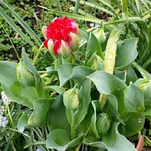 この花壇のチューリップ、だいぶ短くて咲いてしまいました。美しい紅色です。 明日の雨がまた心配。