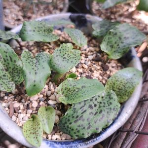 おはようございます😊 活力水モニター中の、ドリミオプシスマクラータ。新芽🌱が出てきました〜✌ ちゃんと黒いドットの入った葉😍他にも新芽と思われる緑が多数😂良かった〜。植え替え、大胆なカット✂️成功⁉️ 結婚式💒&来客対応で、もうしばらく不義理します🙏 (2025/3/30撮影)