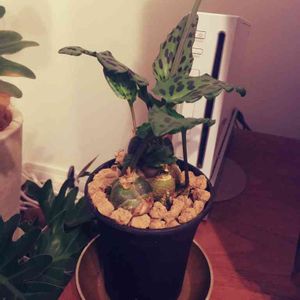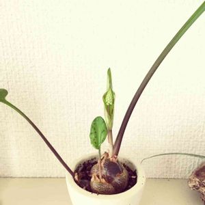 ドリミオプシスマクラータから子供が吹いてる!すっかり水玉模様がなくなった葉っぱだけど、元に戻ってくれるといいな。