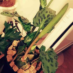 トックリランの仲間みたいな植物買いました。 コモチラン、マクラータのタグが刺さっています。 マクラータの葉っぱのドット柄がカワイイのです。
