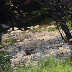 ヒガンバナ(彼岸花 曼珠沙華) 白花のヒガンバナが たくさん咲いていました😃 日中は 暑いけれど 空気も爽やかで 散歩が 楽しい季節になりました😃