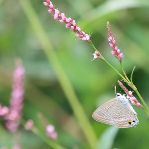 イヌタデ(犬蓼) 今日のお花の イヌタデに 小さな蝶(ウラナミシジミチョウ)が とまっていました😃どちらも かわいい!