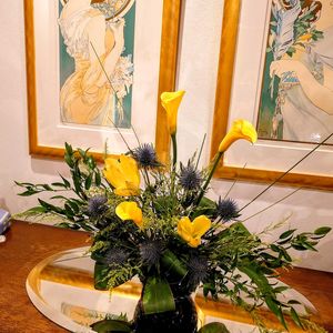 エリンジウムと黄色のカラーの フラワーアレンジメント 今回はレッスンではなく 自力のみなのでかなり不安〜😅 エリンジウムとカラー, 生き残り?のユリ ソリダコ,イタリアンルスカス ドラセナ,ベアグラス