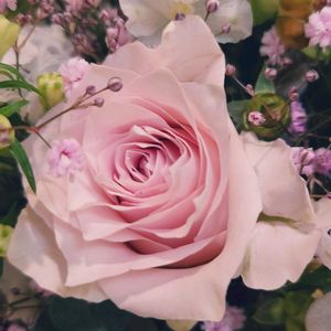 週替りのアレンジ25 今回は優しい色合いのアレンジです。 脇をかためるデルフィニウムとカスミソウも可愛いです❤️