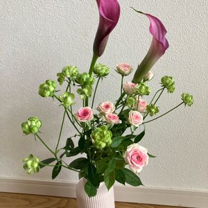 ピンク色のアレンジメント作りました💐 昨日は4年前に虹の橋を渡った猫の命日でした🌈 ‥が、夕食のときに献杯するはずが、熱々のうちに食べねばならぬ?メニュー(チヂミ)にしてしまい、うっかり忘れて食べ終わってから、ハッ、しまった〜😆🥹😅💦 お花もお供えしていたのに‥🙇♀️食い気に負けてスミマセン💦 シャー ฅ(`ꈊ´ฅ)🙏🙇♀️