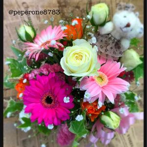 ✲誕生日アレンジ✲ お花が好きなお友達の誕生日 クマのキーホルダー付き 白いスプレーバラが綺麗で ピンクのガーベラが 色々あって可愛い… しっかり者でキュートな彼女に 贈る友達も 贈られる友達も どちらも知ってるだけに 好みもわかるわ(*˘︶˘*).。.:*♡
