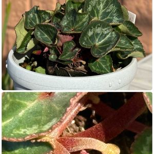 ベランダの植物 ①シクラメン森の妖精✖️クレヨン 2022年9月に種蒔きしてここまで育ちました😊 下の方には蕾のようなものが😍 咲くと嬉しいな ②鉢植えブルーベリー全体から紅葉しました🪴🫐見上げた紅葉と順光でパチリ ③おうち野菜キャロルツリーです😊 剪定した枝を挿木して鉢植えに仕立て、株が枯れたので根元からカットして放置したら脇芽が伸びて実を付けました(文が長い😅) 年末まで持たないかと思ったら暑かったので熟す所までこぎつけた😋 ④アリッサムが夏越しして咲いて来ました🎶