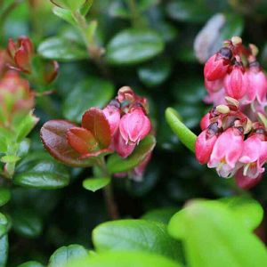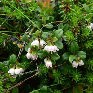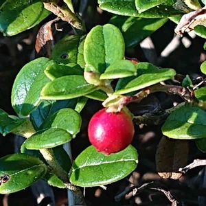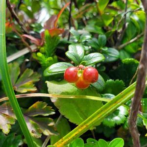 コケモモの実 甘酸っぱい味の赤い実をつけます。熟すと赤くなるが完全に熟す前は、桃やリンゴにそっくりの色合いをしている。