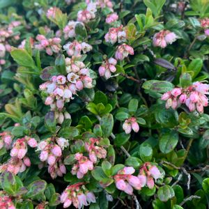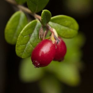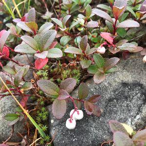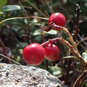 コケモモ-苔桃-(ツツジ科) 高原から高山までの日当たりのよい草地に多く、淡桃色の花を付けます。こちらは花の後の赤い実です。 マウンテンクランベリー🌸リンゴンベリー