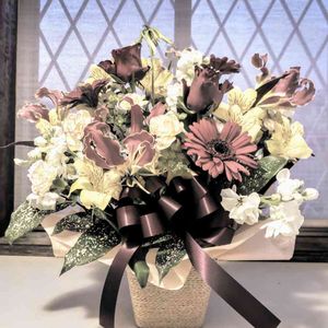 いただいたアレンジメントを写真に撮ったのですが、背景の色もピンクでカラフルすぎるので、加工して色味を抑えてみました。😄 ちょっと抑えすぎたかな?😆 頑張れ❗日本‼️ ✊‼️