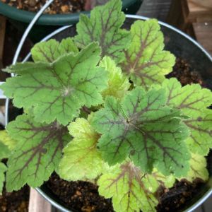 9月のpicよりも 葉脈の赤が よりくっきりはっきりしてきたヒューケラ・エレクトラ。 ハンギングを解体して寄せ植えにしました👍