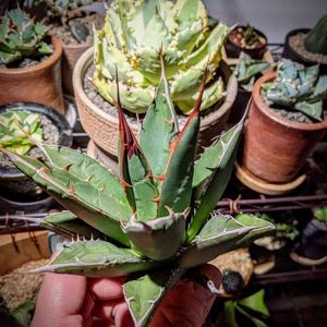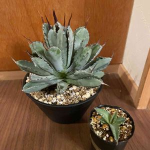 こんばんわ🌙 半年間頑張った自分へのご褒美にアガベさんを買いたいと思っていたのですが、うん、高価すぎる😭 こんなの買えないよー😭 って事で、妥協することにしまして、この子達をお迎えしました。 総額3000円でした😄 上の2つは欲しかった子で、妥協してチビッ子苗を購入して自分で大きく育てます😊💓 下の子達は、訳有り品種見計らい品!要は何が来るか分からない&少し痛みがある子です😊😊😊 これで、十分です! 大きくなればこの傷んだ葉も隠れると思いますし、これから元気に育ててあげれば良いんですよね(*^^*)💕 それも、1つの植物さんを育てる楽しみにですもんね😉👍 名前を確認→ネットで成長した姿を確認→育て方を確認しましたよ😄 どっぷり両足👣共にアカベさんの沼にはまってしまいました😂