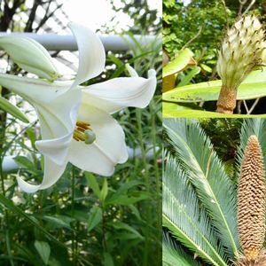 職場で見つけた植物🌿 ⬅️テッポウユリの仲間。テッポウユリかタカサゴユリか、はたまたシンテッポウユリか?どうして私に区別できよう? ↗️タイサンボクの花後。 ↘️蘇鉄の雄木。 私の職場にはいろんな樹木が植えられています。「まとめ」にしてありますので、興味のある方はキーワード「職場」をタップしてご覧下さい🤗