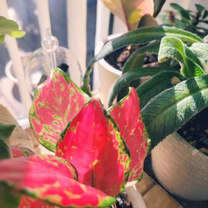 窓辺の越冬隊たち...♡ ダイソーアグラオネマ(アンヤマニーレッドらしい) 今は真っ赤で綺麗♦️✨だけど... 緑化得意なのでどうなる事やら🥲 同じくダイソーチランヂアに桃🍑のような蕾が😍 どんな花が咲くのかな💓初蕾なので調べずにお楽しみにしておきます🥰🥰