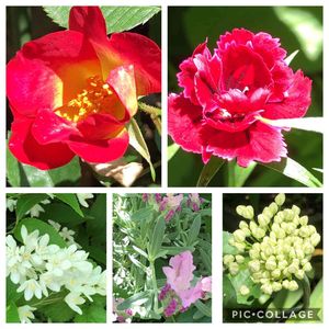 バラと夢CLUBの会員になっていたものの、会員になってから一度も薔薇🌹の写真をアップ出来ませんでしたが、やっと我が家の薔薇咲き始めました💕 名前はわかりませんが、10年以上も前に、知り合いから挿し木する為に頂いだ薔薇が今じゃ我が家の花壇を占領してます😂 右下のアルメリアは、4月に実家に行って帰って来たら瀕死の状態でしたが、何とか持ち直して第二弾咲いてます。左下ご飯前の待ってる状態のニコル🐶