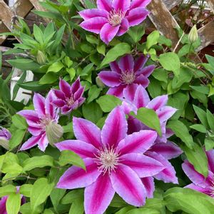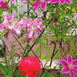 クレマチスゾーン 白万重(うす緑)がもうすぐ咲きそう ドクターラッペル(桃)が一輪開花済み ポーリッシュスピリット(濃紫)は間違いなく、初爆発的開花🙌 だけど絡ませた薔薇ブルーフォーユーの花期間に間に合うか?エンテル(淡桃)は最後に咲きそう 手前の白麗とベンダーソニーはもう咲きそうです😊