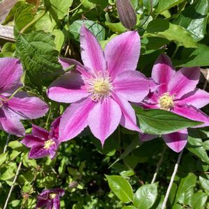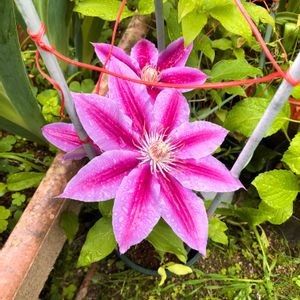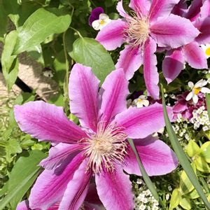 クレマチス✨ドクターラッペル 庭を作るときに掘り起こして去年は咲かず、うっかりしていたら 今年はヒョッコリ咲いてくれました👏👏👏💕 でも、薔薇との競演✨✨ のはずが ツルを誘引し忘れていたので、薔薇🌹の下でグシャグシャに団子状態に😳 野の花の様になっちゃいました💦 もう移動はしたくないので、 来年以降はしっかり誘引⚠️ 忘れなようにしなきゃデス