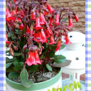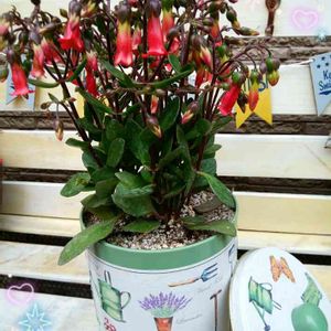 今日は雨の一日ですね☔ この前お迎えしたカランコエ💕 『ハッピーベル🔔』 レッドとピンクがあり、お花と蕾がいっぱいのレッドを選びました~(≧∀≦)✨ ベルの形のお花が可愛くて~🔔 満開になったら賑やかになりそ~💞 カルディのクッキー缶がぴったり(*^^*)🍀