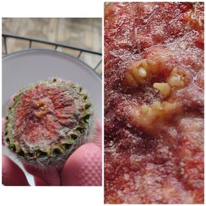 去年、胴切ったまま芽の出ないサボテンを 昨夜からメネデール風呂に漬けています。(るい子さんに教えていただきました。感謝!) さっき裏をみたら、ごまより小さい根のような物が生えてる? ように見えます。 もう生えたのか!?