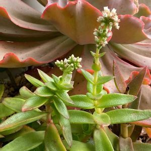《オクサマが育てるダンディ邸の多肉植物🪴》 大きく育ってしまった 「エケベリア」(笑)🤣 その前で追い出されそうな 「モミジマツリ」 白い花が咲いたので今日はあなたが主役よ♪🤗💕