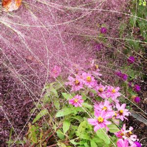 3つの植物が色合い、花の形状の違いが楽しく、美しい花壇。