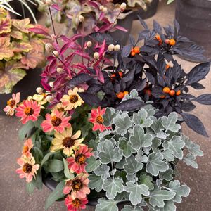 ちょっと前に作った ジニアと唐辛子の寄せ植え