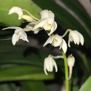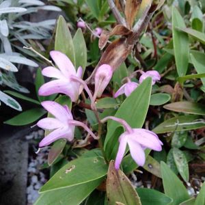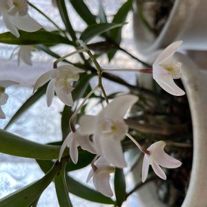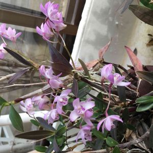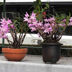 🍀デンドロビウム・キンギアナム🍀 毎年上手に咲かせられないキンギアナム。 木に水苔を巻いて植え付けているピンク。 まばら咲きですがまだ良く咲いたほうです。 白花の方は株がしっかりしてきて、やっと咲きましたよ。🤗🎶🎵 こちらは鉢植えで木に吊り下げています。