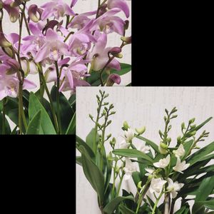 開花🌸 ①デンドロビウム ミカワリバティ 紫のドットとストライプが綺麗🥰 ②ミニカトレア ミラクルショット 'ひばり' 2ヶ月前の開花からまた2輪🧡 胡蝶蘭も最盛期を迎えそろそろ✂️ 生け花のセンスがあればなぁ☺️と毎年思う🤔