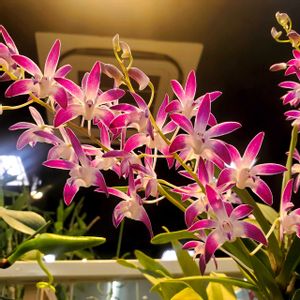 デンドロビウム・キンギアナム 咲きました。とは言え、出窓でエアコンの風に当ててしまい、ほとんどの花茎からツボミが落ちてしまい、花茎が上がっている鉢をあわてて移動しました。