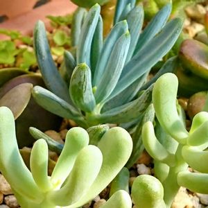 おはようございます😃 一斉紹介(158)です〜❗️😄 キク科 セネシオ属② ⭐️美空の鉾(194) Senecio antandroi❗️ 断面の丸い細長い葉を上に向かってロゼット状に広げる子、水が多過ぎると葉が広がる、乾燥気味に❗️😄 葉には、粉吹きが有ります❗️🥰 ⭐️万宝(153) Senecio serpens❗️ 中央が少し凹む船形の粉吹きした葉、この子もツボミが上がってます❗️🥰 ⭐️新月(540) Senecio scaposus❗️ 丸い断面の細長い葉をロゼット状に出しますが、"美空の鉾"と違い葉に薄い膜が、剥がれると、中には緑色の葉❗️😄 被膜を破らないように❗️😅 ⭐️紫蛮刀(しばんとう)(365) Senecio crasihamata(crasiissimus)❗️ 別名"クラシハマタ"等。 船形の葉を垂直に広げ、葉の縁は紫色❗️😄 変わってます❗️🥰