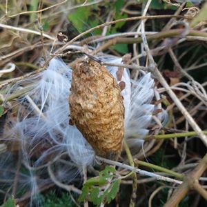 ガガイモ(蘿摩) キョウチクトウ科 イケマ属 8~9月 長さ〜8m つる性 在来種 多年草 ガガイモの果実(袋果)があったのでちょっと持ち上げてみたらその瞬間、突然にモコモコモコと種子が溢れ出し、うわうわ大変💦(大変じゃないwww)となりながら撮ったもの😂 緑色の果実はまだ未熟かと思いきや、こちらも裏返して見た瞬間に種子が溢れ出してきた😆 (既に裂開していたみたい) 花は2心皮(離生心皮)であり、ひとつの心皮からひとつの袋果が出来る 果実は心皮が袋状に合わさって種子を包む袋果(長さ8~10cm) 熟した果実は腹縫線(縫合線・内縫線)で縦に裂けます 種子は扁平で周囲に翼があり(種翼)、絹糸のような種髪がつきます 種髪と種翼、ダブルで風散布に適したスタイル♡ 種髪は柔らかくしなやかにキラキラと輝いていました✨ _φ(・_・ 『種髪』は「種子」につく毛で、種皮が変化したもの(珠皮起源) ex)アカバナ属や、キョウチクトウ科のキジョラン、ガガイモなど 『冠毛』は「果実」につく毛で、子房下位の花の萼が変化したもの ex)キク科のタンポポやアザミなど