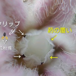 → ガガイモ(蘿藦) キョウチクトウ科 イケマ属 8~9月 長さ〜8m つる性 在来種 多年草 ――――――――――――――――――――――――――――― 長い独り言 ①花粉塊は葯の覆いの下にあり、やじろべえのようにクリップと繋がっている (5個のクリップに2個ずつの花粉塊、全部で10個) クリップには切り込みがある ②花冠の奥の方(底部)に見える切れ込んだ部分が柱頭室への入り口かもしれない ここは既に蜜がたっぷり溜まっており、その奥にある柱頭室も蜜で満たされているそうだ この入り口から上部のクリップがある部分までは狭い隙間があり、サイドには上向きの刺があって、吸蜜に訪れた虫の口吻はもはや上にしか動かせない(吻とは限らないが…) そうやって上に移動した後、クリップの切り込みに上手く挟まれば、クリップごと花粉塊が取り出されることになる ただし、体が小さすぎて早々にまんま挟まってしまったり、クリップまでたどり着けてもそれを取り出す力がなかったり…なんだかんだで途中で死んでしまう虫たちもいるようだ 彼らも命がけだ しかもこの状況はガガイモにとっては不利なわけで… クリップに挟まれ花粉塊をつけた昆虫は、そのまま次の花へ移動し、再びあの底部の入り口へと向かう そこで上手く花粉塊を柱頭室に落とすことができれば受粉の準備はOK 仮に柱頭室内に落とされなくても、花粉塊は自然と柱頭室内に引き込まれて行くらしい(これは蜜の効果による) ここで花粉塊やクリップが外れなかったらいったい… そもそも途中どこかで落としたりしないものなのかな?と普通に思うwww ③どう見ても花粉塊が運び出されている(ように見える) クリップがないぞ(そう見える) 誰だ~