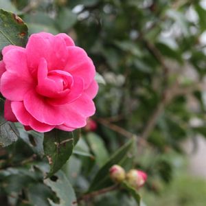 「サザンカ」 ツバキ科ツバキ属 常緑広葉樹の小高木 花期は秋の終わりから初冬 花の奥には蜜があり花粉の 授受は昆虫と鳥に頼っている。 (解説者によっては虫媒花) 花弁が1枚毎に散るのが ツバキとの見分けポイント 近隣のサザンカの木に蕾だらけ の中に3つ咲いていてその内の 2つは既に咲ききっておりました。