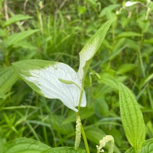 ハンゲショウ(半夏生)🤍💚今日のお花 昨日7/2の半夏生の日に 洞昌院 萩寺(埼玉県秩父郡長瀞町)の駐 車場の前の畑にて撮影 暑〜い中🥵葉っぱの白さが眩しい✨ 🐝虫媒花なので、花期になると、この白さで虫を誘い、 花期が終わると葉の色は緑色になるらしい それなら、私も花の時期でないと、気付かないし、花が終わって葉が緑色になったら、ハンゲショウとは、わからないわねー
