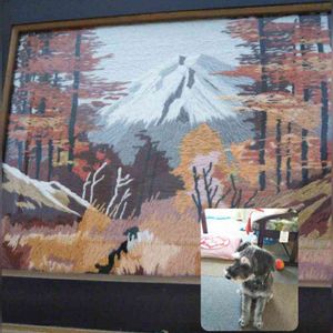 こんばんは。岩手山にも雪⛄が降ったので、そろそれこの作品も投稿していいかなと😊 これは文化刺繍といいます。私が遥か昔中1の時の夏休みか冬休みの作品です。実家で大切に保存していたんですが、持っていきなさいと言われ今は我が家に飾ってあります☺️ 真ん中にある山は多分富士山ですかね。