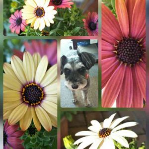 我が家にあるオステオスペルマム。前にアップした紫紅色に黄色、白の3色 夜は室内、日中は外におります😋 中央はニコル🐾またしても私に訴えかけてる顔をパチリ📱