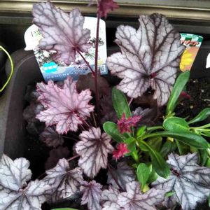 パンジーとヒューケラとユーカリの寄せ植えです。