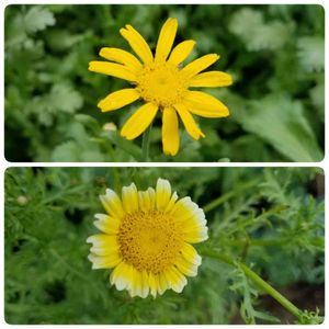 💛春菊の花 2投稿目 薄い白黄色~黄色のグラデーションが可愛い! 先日投稿した株の15cmほど隣の株からのお花! 花の色は、土壌の微妙な違いで変わるもの? あまりに可愛いので、花瓶に生けて愛でています!