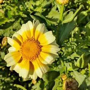 春菊のお花が咲きました🌼😍 3株程地植えにして暫くは延びてはカットしてを繰り返して食べていましたが流石に葉も伸びが良く無くなってきたので鉢に移して放っておいたら可愛いいお花が咲いていました💖💖💖👏 とても可憐な素敵なお花でした😍 もう暫くこのままにしておこうと思います🤗